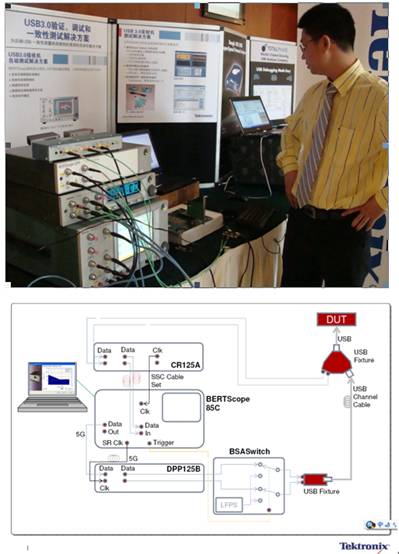 如USB2.0應用一樣,泰克為USB3.0的發射機測試提供了超過規範要求的完整解決方案(手動和自動可選)。對於複雜得多的接收機測試,泰克則展示了最新的BERTScope解決方案,可幫助開發者加快USB3.0的一致性測試速度。