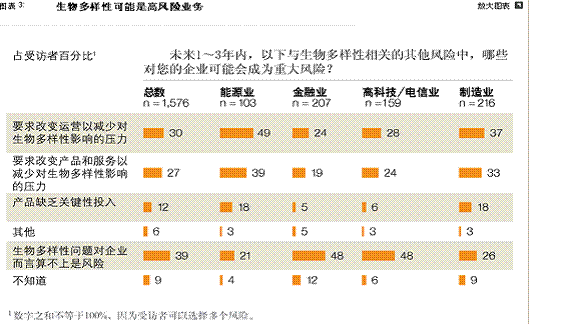 raner,womenhaifaxianlezheyangyiqunshoufangzhe,tamenbiaoshishengwuduoyangxingduitamendegongsieryanhenzhongyao,shiyizhongjiyu,bingyugongsideyewumubiaoyizhi。zhequnshoufangzheduoyoushipinyuyinliao、製藥和能源企業以及醫院的高管組成。對他們而言,水資源缺乏、傳chuan染ran性xing疾ji病bing和he食shi品pin安an全quan位wei列lie生sheng物wu多duo樣yang性xing和he企qi業ye麵mian臨lin的de潛qian在zai風feng險xian之zhi首shou。食shi品pin與yu飲yin料liao行xing業ye依yi賴lai農nong業ye生sheng產chan用yong水shui,所suo以yi它ta理li所suo當dang然ran會hui關guan注zhu未wei來lai食shi物wu的de獲huo取qu;製藥企業和醫院在開發傳染性疾病的療法方麵有既得利益;對於能源公司而言,其生產流程涉及用水以及眾多其他生物多樣性問題,例如,土壤退化、森林砍伐以及洪水泛濫。這群受訪者中有61%的高管表示生物多樣性對於鞏固其公司的競爭地位很重要,這一比例是其他行業持此觀點的受訪者的2倍之多;1/4degaoguanbiaoshi,ruguoshengwuduoyangxingjianshaodehua,tamendegongsijiangmianlinchanpinshiquguanjiannengyuanhuoyuancailiaogongyingdefengxian。buguo,jishiduiyuzhexiegongsieryan,shengwuduoyangxingzaisuoyouhuanjinghekechixufazhanwentizhongyejinjinpaizaidi4位。