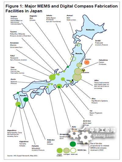 IHS iSuppli公司的研究顯示,位於日本的22家最重要MEMS與羅盤工廠中,隻有三家受到直接破壞,不過其它19家工廠可能受到困擾整個日本的物流與供電問題影響。三家受損工廠分別屬於飛思卡爾、佳能和德州儀器。下圖顯示了日本各地的MEMS與數字羅盤工廠分布情況。