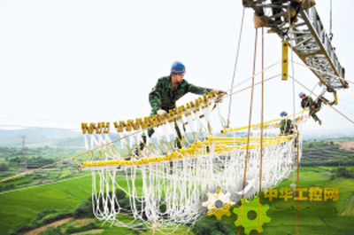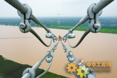施工人員在±660千伏寧東—山東直流工程黃河大跨越現場安裝“防舞動”間隔棒。徐可 攝(英大圖片)