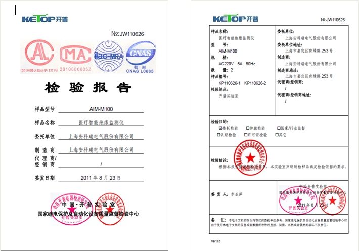 2011年8月23日,公司自主研發的AIM-M100型醫療智能絕緣監測儀,通過了國家繼電保護及自動化設備質量監督檢驗中心型式試驗檢測,並獲得合格檢測報告(編號:JW110626)。