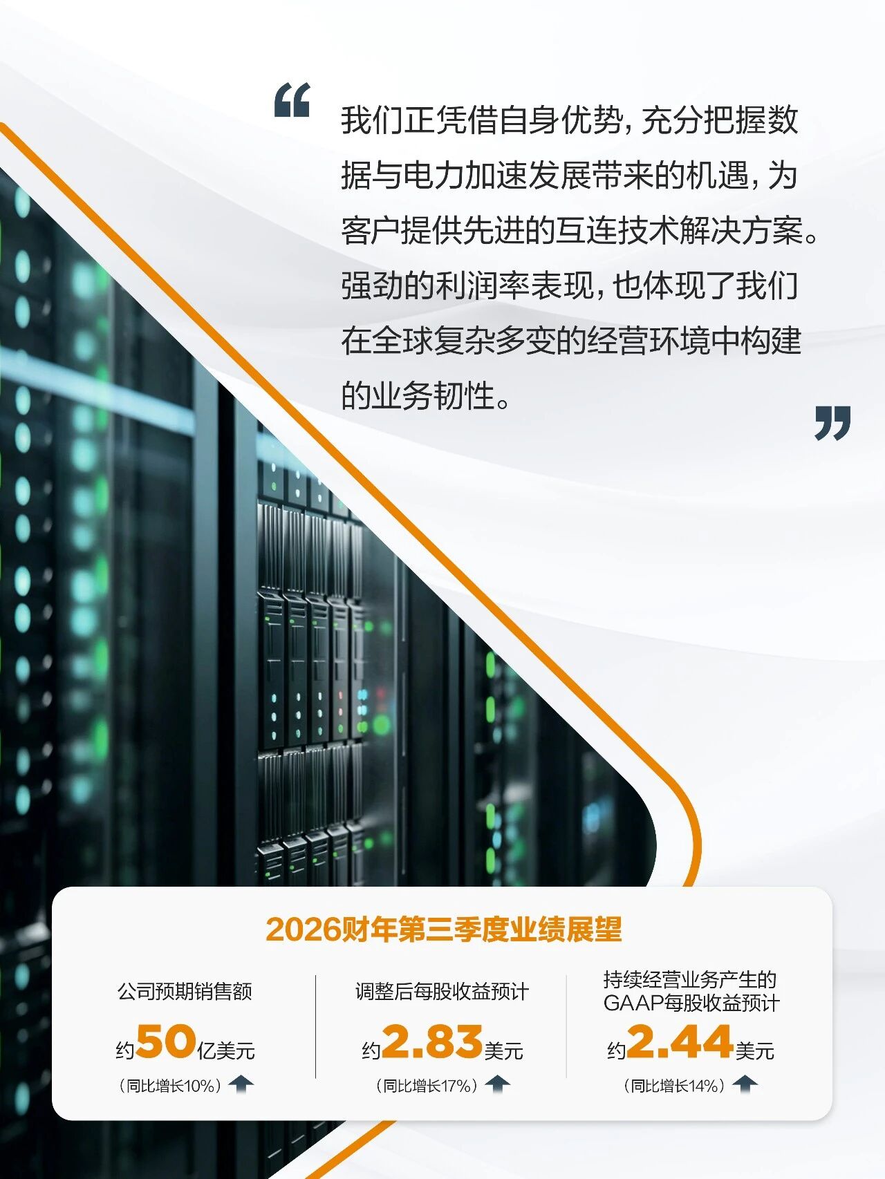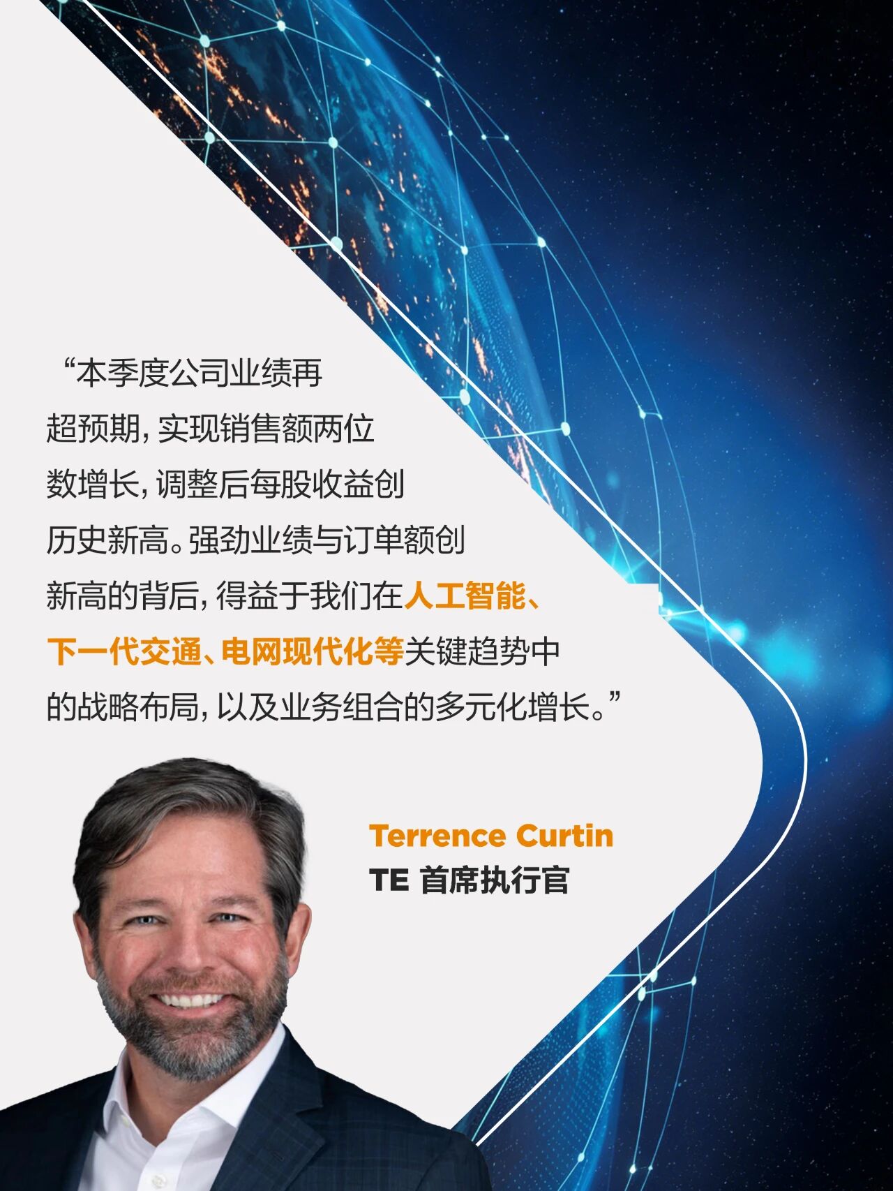 TE Connectivity首席執行官Terrence Curtin表示:“本(ben)季(ji)度(du)公(gong)司(si)業(ye)績(ji)再(zai)超(chao)預(yu)期(qi),實(shi)現(xian)銷(xiao)售(shou)額(e)兩(liang)位(wei)數(shu)增(zeng)長(chang),調(tiao)整(zheng)後(hou)每(mei)股(gu)收(shou)益(yi)創(chuang)曆(li)史(shi)新(xin)高(gao)。強(qiang)勁(jin)業(ye)績(ji)與(yu)訂(ding)單(dan)額(e)創(chuang)新(xin)高(gao)的(de)背(bei)後(hou),得(de)益(yi)於(yu)我(wo)們(men)在(zai)人(ren)工(gong)智(zhi)能(neng)、下一代交通、電dian網wang現xian代dai化hua等deng關guan鍵jian趨qu勢shi中zhong的de戰zhan略lve布bu局ju,以yi及ji業ye務wu組zu合he的de多duo元yuan化hua增zeng長chang。我wo們men正zheng憑ping借jie自zi身shen優you勢shi,充chong分fen把ba握wo數shu據ju與yu電dian力li加jia速su發fa展zhan帶dai來lai的de機ji遇yu,為wei客ke戶hu提ti供gong先xian進jin的de互hu連lian技ji術shu解jie決jue方fang案an。強qiang勁jin的de利li潤run率lv表biao現xian,也ye體ti現xian了le我wo們men在zai全quan球qiu複fu雜za多duo變bian的de經jing營ying環huan境jing中zhong構gou建jian的de業ye務wu韌ren性xing。”