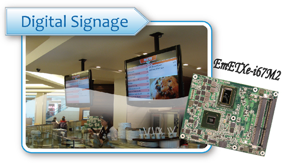 EmETXe-i67M2整合Intel® HD 3000繪圖核心,具有流暢、高效能繪圖處理能力,並提供雙頻道24位LVDS、VGA及DDI數字顯示接口(支持HDMI, DVI, DisplayPort及SDVO),可支持任兩種獨立顯示;靈活、彈性高的顯示功能,適合用在電子廣告牌、博弈機、醫療影像等需要多媒體顯示的應用。