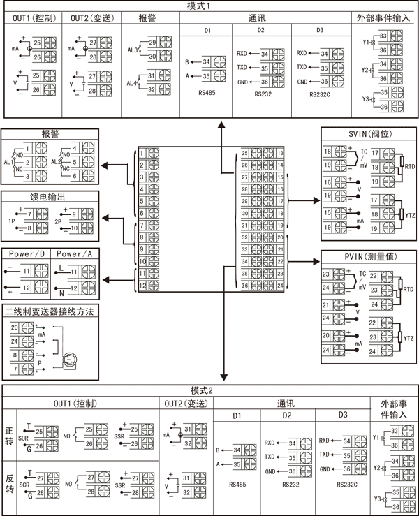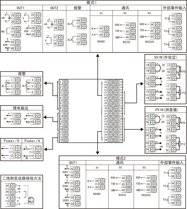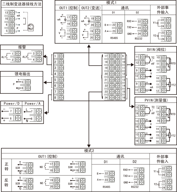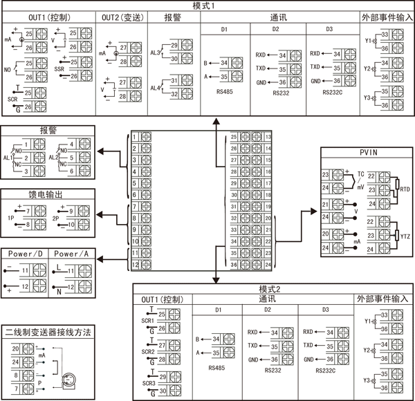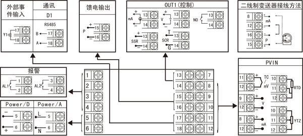 可帶一路PID控製輸出和一路模擬量變送輸出,具有電流、電壓、SSR驅動、單/三相可控矽過零觸發、繼電器接點等輸出控製方式可選擇。
