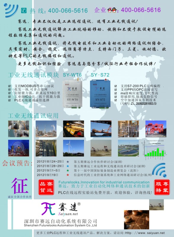 賽遠將在8月24~25日和28~29日於深圳總部舉辦第五期賽遠合作夥伴研討會和第五期賽遠工業遠程和無線通訊技術研討會。9月1~5日於沈陽參展第十一屆中國國際裝備製造業博覽會,19日於杭州召開信息時代的工業控製係統和工業網絡通訊研討會,歡迎廣大客戶蒞臨現場了解和洽談合作。