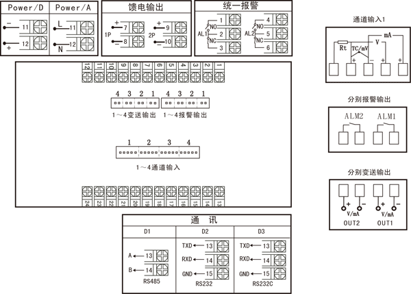 注: 1、上述接線圖中在同一組端子標有不同功能的,隻能選擇其中一種功能。如RS485和RS232在同一組接線端子上,隻能選擇一種。 2、統一變送輸出的接線端子在1號輸出端子上。 |