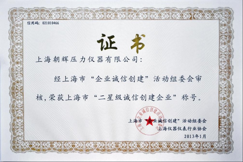 上海朝輝壓力儀器有限公司自1999年成立以來,一直非常重視企業誠信建設,公司多年多次獲得“重合同守信用”企業,且繼2011年獲得“誠信創建企業”、2012年獲得“一星誠信創建企業”後,2013年朝輝再次榮獲“二星級誠信創建企業”稱號(信用碼:021010466,可通過www.51315.com查詢),這將鞭策我們朝輝全體家人將“誠信”踐行到底。