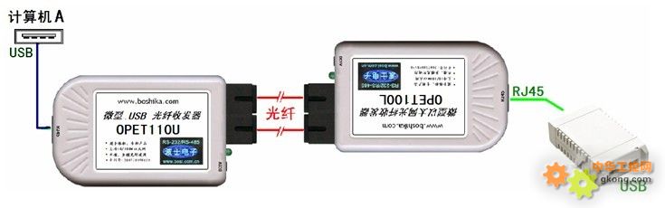 用光纖來構築遠程USB口的最實用的方法是將計算機的以太網用光纖延長後再在遠端加以太網/USB轉換器。波仕電子的OPET-USB是最新一代USB光纖通信產品,實現了USB信號在以太網光纖中的遠程傳輸。