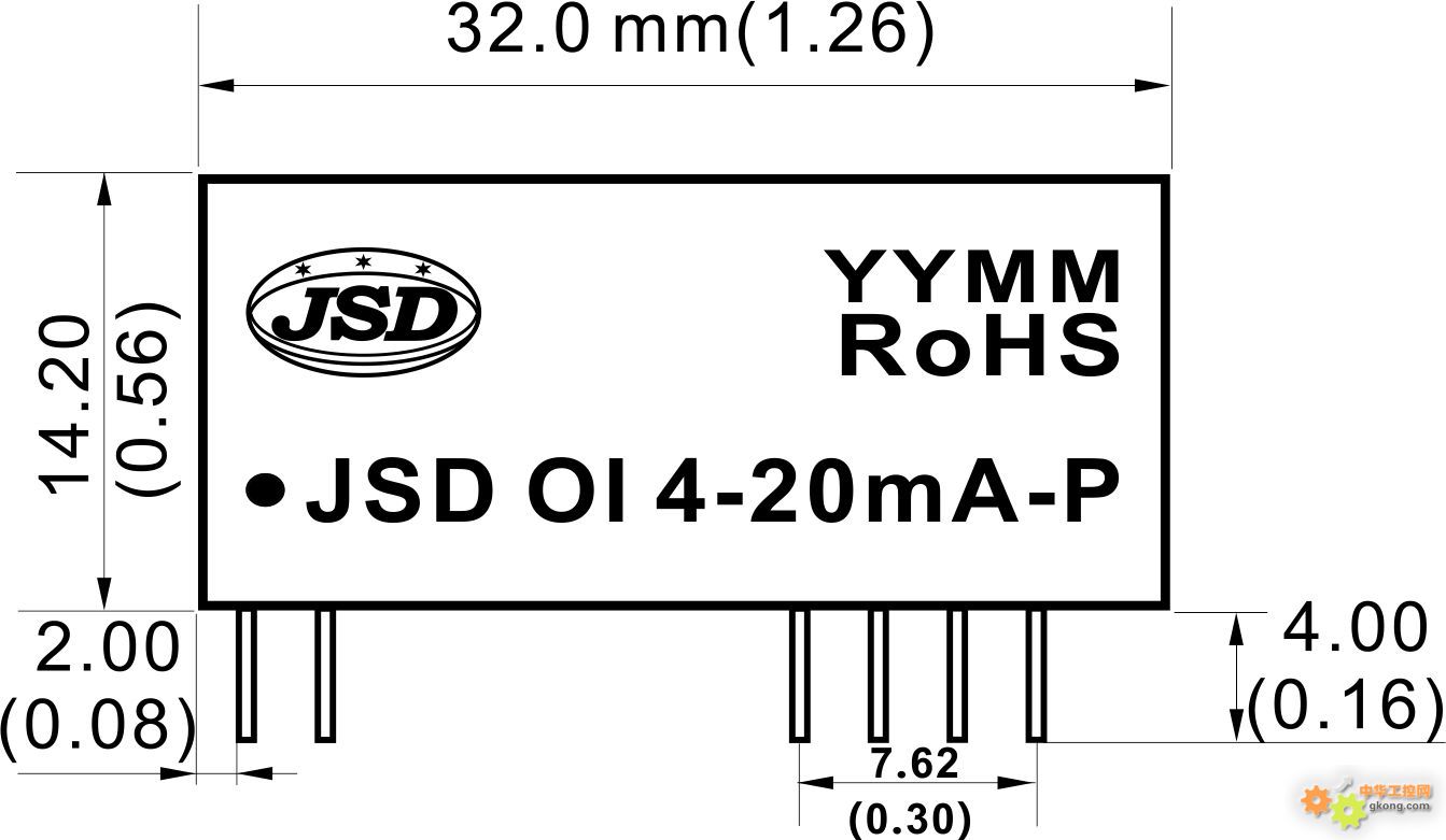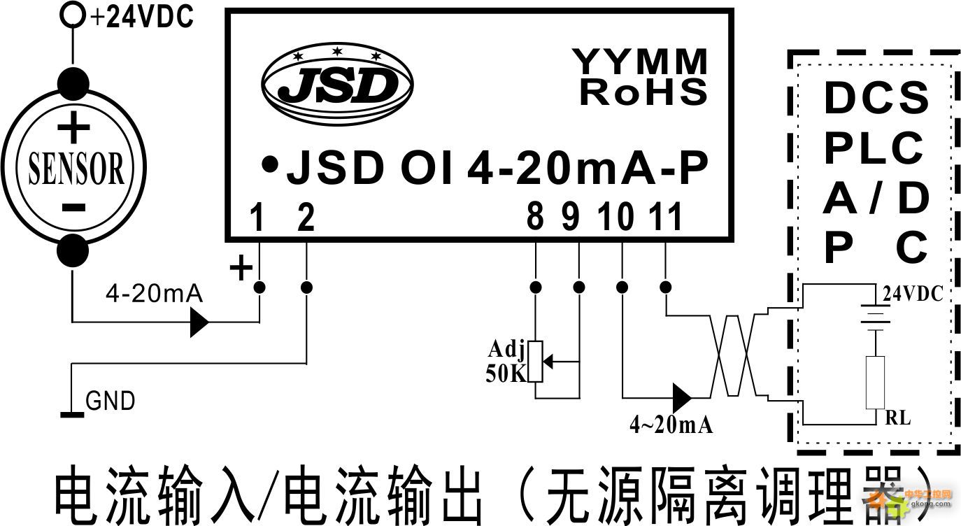 JSD OI 4-20mA-P產品使用非常方便,隻需外接一個50KΩ的多圈電位器進行ADJ校正,即可實現兩線製4-20mA信號的隔離放大與變換。