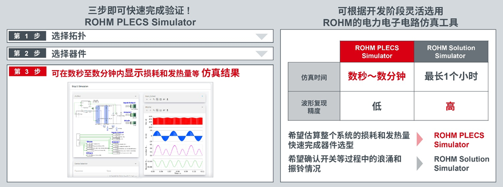 針對這一需求,ROHM推出了“ROHM PLECS Simulator”,專門用於損耗和熱計算。用戶可以利用PLECS®進行快速的初期探討,運用“ROHM Solution Simulator”的優勢進行詳細且高精度的驗證,並根據不同的開發階段進行區分使用,進而實現從設計的損耗和發熱驗證到波形檢查的一體化仿真。