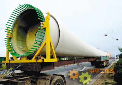 5月21日,連雲港中複連眾複合材料集團公司出口海外的兆瓦級風機葉片啟運。耿玉和 攝(英大圖片)