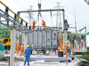 輸變電設備是我國最具出口競爭力的機電產品種類之一。圖為四川省電力公司人員在檢修110千伏河堰變電站一號主變。謝疏濤 張啟富 攝