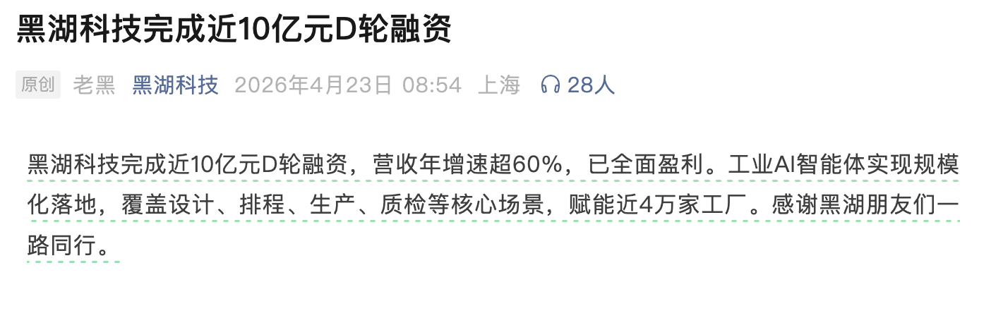 4 月 23 日,國內工業 AI 領軍企業黑湖科技宣布完成近 10 億元人民幣 D 輪融資。公司同步披露核心經營數據,其營收年增速超 60%,已實現全麵盈利;自主研發的工業 AI 智能體已完成規模化商業落地,覆蓋設計、排程、生產、質檢等製造全流程核心場景,累計賦能近 4 萬家工廠,成為工業 AI 賽道少有的實現高增長與盈利雙突破的標杆企業。