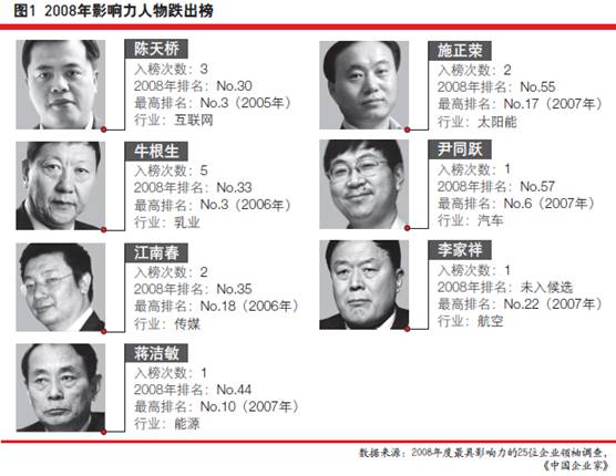 我們第一次編製了一份“影響力人物跌出榜”(見圖1、圖2),僅從數字上看,2008年就有7位影響力人物從上一年的榜單上跌出,是曆年之最。