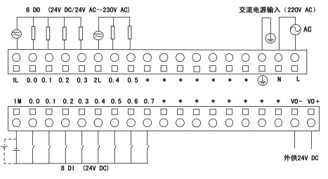 ¿ÉÒÔÊǽ»Á÷¹©µç£» 4¡¢ÉÏÅŶË×ÓÓÒ²àµÄLºÍN·Ö±ð½Ó¸øÄ£¿é¹©µçµÄAC220V»ðÏߺÍÁãÏß½ÓÏß¶Ë, ±íʾ±£»¤µØ£» 5¡¢ÏÂÅŶË×ÓÓÒ²àµÄVO£«¡¢VO£·Ö±ðΪCPUÄ£¿éÍ⹩24VDCµçÔ´µÄÕý¸º½ÓÏß¶Ë×Ó£» 6¡¢¡°*¡±±íʾ´ËͨµÀ²»½ÓÏß»òÎÞʵ¼ÊÎïÀíÁ¬½Ó¡£