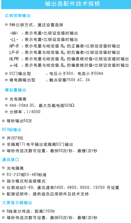 ÊäÈëÐźţº¸÷¹¦Äܵç×èÓ¦±äʽ²âÁ¦¡¢Óë³ÆÖØ´«¸ÐÆ÷»òÀ©É¢¹èѹÁ¦´«¸ÐÆ÷µÄÖ±Á÷µçѹ¡¢µçÁ÷ÐźÅÏÔʾ·½Ê½£º5λ16mm¸ßÁÁ¶ÈLEDÏÔʾ±È½Ï¿ØÖÆÊä³öÊý£¨Ñ¡Ôñ£©£ºµã±È½ÏÊä³ö£¬ÓÐ6ÖÖ¿ÉÑ¡ÔñµÄ·½Ê½¡£±È½ÏÖµºÍ±È¼Û¿ØÖÆÊä³öÁéÃô¶È¿ÉÉèÖÃÄ£ÄâÁ¿Êä³ö£¨Ñ¡Ôñ£©£º4mA20mA¹âµç¸ôÀëÊä³öÃ«ÖØÖµBCDÂëÊä³ö£¨Ñ¡Ôñ£©£º²¢ÐÐ29λ·Ç¸ôÀëTTLµçƽÊä³ö»ò¸ôÀëOCÃÅÊä³öͨѶ½Ó¿Ú£¨Ñ¡Ôñ£©£º¾ßÓбê×¼µÄRS-485¡¢RS-232½Ó¿Ú£¬µØÖ·¡¢ËÙÂÊ¿ÉÉ趨´óÆÁÏÔʾÆ÷Êä³ö£¨Ñ¡Ôñ£©£º6Ïß²î·Ö´«ËÍ£¬Ã¿Ãë´«ËÍ´ÎÊý¿ÉÉèÖ㬾àÀë1200mÊý×ÖÂ˲¨£ºÂ˳ýÊäÈëÐźÅÖÐµÄ¸ßÆµÐ¡·ùÖµ¸ÉÈÅ£¬Ê¹Ê¾ÖµÎȶ¨¡¢×¼È·Áãλ¸ú×Ù¼°×Ô¶¯ÇåÁã£ºÖØÁ¿ÔÚÁãλ¸ú×ÙÉ趨·¶Î§ÄÚ±£³Ö1ÃëÒÔÉÏʱ£¬¶ÁÊý½«¸ú×ÙÖÁÁã±ä¶¯¼ì²â£ºµ±²âÁ¿Öµ1ÃëÄڵı仯Á¿³¬¹ýÉèÖõÄÏÔʾ·Ö¶Èֵʱ£¬²»Ö´ÐÐÇåÁã¡¢È¥Æ¤ÖØ¡¢Áãλ¸ú×ٵȲÙ×÷Êä³ö¿ØÖÆÈ¨Ñ¡Ôñ£ºÑ¡ÔñÁËͨѶ½Ó¿Úʱ£¬±È½ÏÊä³ö¼°Ä£ÄâÊä³öµÄ¿ØÖÆÈ¨Í¨¹ýÉèÖÿÉÒÔÔÚ¼ÆËã»úºÍÒDZí¼äÑ¡ÔñÍⲿÇåÁã¿ØÖÆ£ºÍ¨¹ý¿ª¹ØÁ¿ÊäÈëÖ´ÐÐÍⲿÇåÁãÖ¸Áî´òÓ¡½Ó¿Ú£¨Ñ¡Ôñ£©£ºÊµÏÖÊÖ¶¯¡¢¶¨Ê±´òÓ¡ÐͺŹæ¸ñ£º