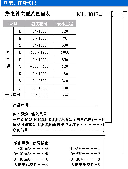 ¶©»õÐëÖª£º1¡¢²ÎÕÕÑ¡Ð;ÙÀý£¬ÕýÈ·¹æ·¶Êéд¶©»õÐͺŴúÂë¡£¡ñ ¾ÙÀý1 ÊäÈ룺K 0¡«1300¡æ / Êä³ö£º 4¡«20mA¡ñ ¶©»õ´úÂëΪ£ºKL-F074-FA£¨K 0¡«1300¡æ£© ¾ÙÀý2 ÊäÈ룺K 0¡«1300¡æ / Êä³ö£º 1¡«5V ¶©»õ´úÂëΪ£ºKL-F074-F1£¨K 0¡«1300¡æ£©¡ñ ¾ÙÀý3£¨ÖÇÄÜ¿É×é̬£© ÊäÈ룺E 0¡«1000¡æ / Êä³ö£º 0¡«20mA ¶©»õ´úÂëΪ£ºKL-F074-IB£¨E 0¡«1000¡æ£©