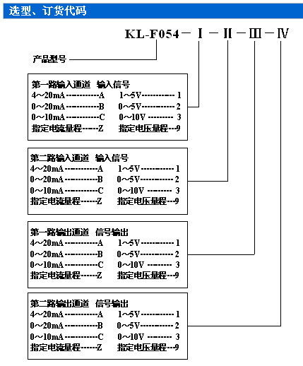 ¶©»õÐëÖª£º1¡¢²ÎÕÕÑ¡Ð;ÙÀý£¬ÕýÈ·¹æ·¶Êéд¶©»õÐͺŴúÂë¡£¡ñ ¾ÙÀý1 ÊäÈ룺 1·4¡«20mA£»2·4¡«20mA ¡ñ Êä³ö£º1·4¡«20mA£»2·4¡«20mA¡ñ ¶©»õ´úÂëΪ£ºKL-F054-AAAA ¾ÙÀý2 ÊäÈ룺 1·4¡«20mA£»2· 1¡«5V£» ¡ñ Êä³ö£º 1·4¡«20mA£»2· 1¡«5V£» ¶©»õ´úÂëΪ£ºKL-F054-A1A1