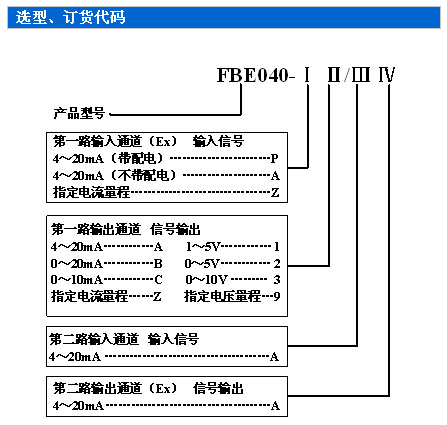 ¶©»õÐëÖª£º 1¡¢²ÎÕÕÑ¡Ð;ÙÀý£¬ÕýÈ·¹æ·¶Êéд¶©»õÐͺŴúÂë¡£ ¾ÙÀý1£º ͨµÀ1ÊäÈ룺4¡«20mA£¨´øÅäµç£©£»Êä³ö4¡«20mA ͨµÀ2ÊäÈ룺4¡«20mA£»Êä³ö4¡«20mA ¶©»õ´úÂëΪ£ºFBE040-PA/ AA ¾ÙÀý2£º ͨµÀ1ÊäÈ룺4¡«20mA£»Êä³ö0~5V ͨµÀ2ÊäÈ룺4¡«20mA£»Êä³ö4¡«20mA ¶©»õ´úÂëΪ£ºFBE040-A2/ AA
