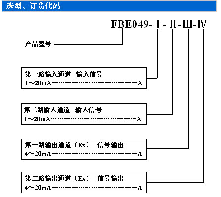 ¶©»õÐëÖª£º 1¡¢²ÎÕÕÑ¡Ð;ÙÀý£¬ÕýÈ·¹æ·¶Êéд¶©»õÐͺŴúÂë¡£ ¾ÙÀý1£º ÊäÈ룺 1· 4¡«20mA£»2· 4¡«20mA Êä³ö£º 1· 4¡«20mA£»2· 4¡«20mA ¶©»õ´úÂëΪ£ºFBE049-AA AA