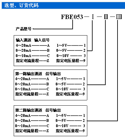 ¶©»õÐëÖª£º 1¡¢²ÎÕÕÑ¡Ð;ÙÀý£¬ÕýÈ·¹æ·¶Êéд¶©»õÐͺŴúÂë¡£ ¾ÙÀý1£ºÊäÈ룺 4¡«20mA Êä³ö£º1·4¡«20mA £»2·4¡«20mA ¶©»õ´úÂëΪ£ºFBE053-AAA ¾ÙÀý2£ºÊäÈ룺 4¡«20mA Êä³ö£º1·4¡«20mA£»2·0¡«5V ¶©»õ´úÂëΪ£ºFBE051-AA2