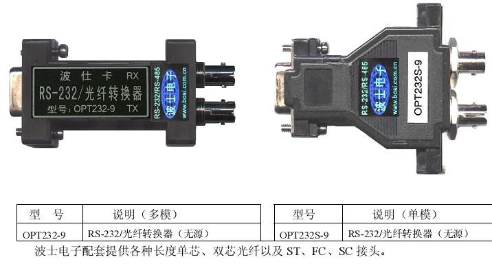 OPT232-9 ÐÍRS-232/¹âÏËת»»Æ÷£¨¶àÄ££©µÄÍâÐÎΪDB-9/DB-9 ת½ÓºÐ´óС£¬ÆäÖÐDB-9(¿××ù)Ò»¶ËÖ±½Ó²åÔÚDB-9оRS-232Õë×ùÉÏ¡¢ÎÞÐëÍâ½ÓµçÔ´£¬Ê¹ÓÃÒ»¶ÔST¹âÏ˽ÓÍ·¡£OPT232S-9 ÐÍ RS-232/¹âÏËת»»Æ÷£¨µ¥Ä££©µÄÍâÐÎΪ DB-9/DB-25ת½ÓºÐ´óС£¬ÆäÖÐDB-9(¿××ù)Ò»¶ËÖ±½Ó²åÔÚDB-9оRS-232Õë×ùÉÏ¡¢ÎÞÐëÍâ½ÓµçÔ´£¬Ê¹ÓÃÒ»¶ÔST¹âÏ˽ÓÍ·¡£OPTϵÁйâÏËת»»Æ÷ʹÓÃʱ·¢ËÍÆ÷STͷͨ¹ý¹âÏ˽ӶԷ½µÄ½ÓÊÕÆ÷STÍ·¡£²¨Ê¿ OPTϵÁйâÏËת»»Æ÷Ö§³Ö¶à»úͨÐÅ¡£×¢Òâ±£³Ö¹âÏËת»»Æ÷µÄST×ù¡¢¹âÏ˵ÄSTÍ·µÄÇå½à£¬Èç¹û²»Á¬½ÓʱÇëÒ»¶¨½«ST×ùºÍ STÍ·ÓÃÏàÅäÌ×µÄÏðƤÈû×Ó¸Çס¡£