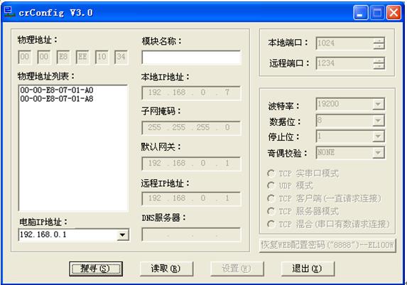 ½«2¸ö²¨Ê¿ÒÔÌ«Íø/´®¿Úת»»Æ÷¶¼²åÉÏ£¬ÔÙÔËÐÐCRConfig.exe¡£°´¡°ËÑѰ"£¬·¢ÏÖÓÐ2¸öIPµØÖ·(Èçͼ4)¡£¾ÍÊÇ2¸ö²¨Ê¿ÒÔÌ«Íø/´®¿Úת»»Æ÷£¬ÕâʱµØÖ·²»³åÍ»ÁË¡£