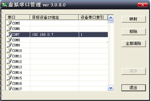 ÔËÐйâÅÌµÄ ¡°ÐéÄâ´®¿ÚÈí¼þ"Ŀ¼Ï嵀 setup£¬°²×°VSPmaneger£¬°²×°ºóÈçͼ8ºÍͼ9¡£ÌîдIPµØÖ·(192.168.0.7)ºÍ¶Ë¿ÚºÅ(ÓÀԶΪ1)£¬°´¡°±£´æ"ºó¡°Í˳ö"¡£¿ÉÒÔÐéÄâ¶à¸öCOM´®¿Ú¡£ÎÒÃÇ·Ö±ð½«2¸ö²¨Ê¿ÒÔÌ«Íø/´®¿Úת»»Æ÷ÐéÄâΪCOM7ºÍCOM8¡£Èç¹ûÓû§ÔÀ´Í¨ÐŵĴ®¿ÚºÅ¾ÍÊÇCOM7¡¢COM8£¬ÄÇôÓû§¾Í²»ÐèÒªÐÞ¸ÄÒѾÓеijÌÐòÁË¡£·ñÔò¾ÍÐÞ¸ÄVSPmanegerµÄÐéÄâCOMºÅ¼´¿É¡£