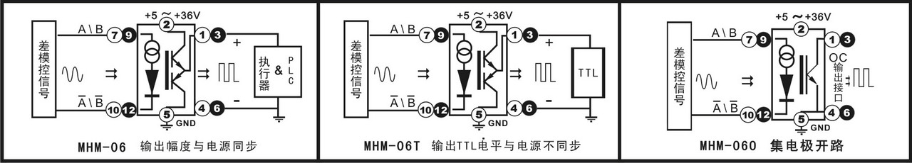 ×¢£º MHM-06 ÊäÈë²îÄ£Ðźš¢Ä£¿éµÄ¹¤×÷µçÔ´·¶Î§¿ÉDC 9 - 30V£¬¶øÊä³ö¸ßµçƽΪ¹¤×÷µçѹ¼õ0.7V MHM-06T ÊäÈë²îÄ£Ðźš¢Ä£¿éµÄ¹¤×÷µçÔ´·¶Î§¿ÉDC 9 - 30V£¬¶øÊä³ö¹Ì¶¨ÎªTTLµçƽ¡£ MHM-06O ÊäÈë²îÄ£Ðźš¢Ä£¿éµÄ¹¤×÷µçÔ´·¶Î§¿ÉDC 9 - 30V£¬¶øÊä³öΪ¼¯µç¼«¿ªÂ·OC¡£