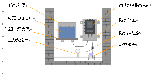 ½«Î¢¹¦ºÄ²â¿ØÖÕ¶Ë¡¢Ðîµç³Ø¡¢¿ª¹ØµçÔ´¡¢¿Õ¿ªµÈ¼¯³ÉÔÚ½ðÊô·À»¤ÏäÄÚ¡£½ðÊô·À»¤Ïä°²×°ÔÚ½ðÊô¸ËÉÏ¡£Ñ¹Á¦±äËÍÆ÷ÐźÅÏß¡¢Ë®±íÐźÅÏß½ÓÔÚ·ÀË®½ÓÏߺÐÉÏ¡£°´½ÓÏßͼҪÇó½ÓÏß¡£