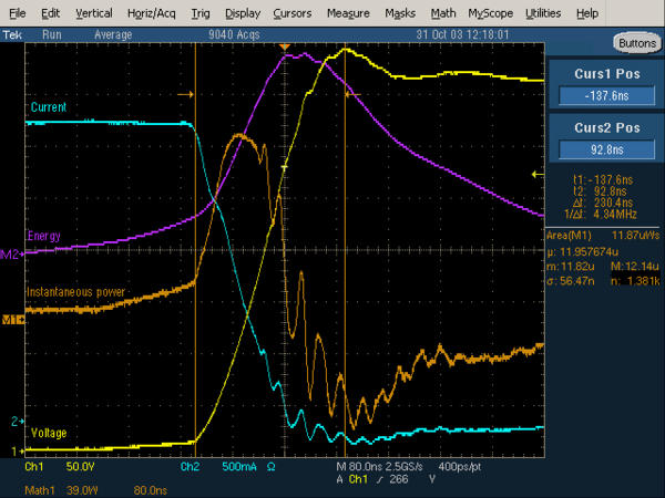 µçÔ´²âÁ¿¡£Í¨µÀ1(»ÆÉ«,±êÇ©×ÖÑù¡°µçѹ¡±)ËùʾΪһ¿ª¹ØµçÔ´FET ÉϵĹضϵçѹ£¬Í¨µÀ2ΪµçÁ÷(À¶É«,±êÇ©×ÖÑù¡°µçÁ÷¡±)¡£Math1²¨ÐÎ, M1(³ÈÉ«,±êÇ©×ÖÑù¡°µçÔ´¡±)Êǵçѹ³ËµçÁ÷²¨ÐÎ(ch.1*ch.2)ºóµÃ³öµÄ˲ʱ¹¦ÂÊ¡£Math2²¨ÐΣ¬M2(×ÏÉ«£¬±êÇ©×ÖÑù¡°ÄÜÁ¿¡±)ÊÇM1µÄ»ý·Ö¼ÆËã½á¹û£¬ÕâÊÇTDS5000B ϵÁеĴ¿Êýѧ¼ÆË㹦ÄÜ¡£»ÃæÓұߵÄÄÜÁ¿²âÁ¿Öµ£¬ÊÇÔÚM1ÉϲâµÃµÄѡֵͨ£¬²¢°üÀ¨Í³¼ÆÊý×Ö