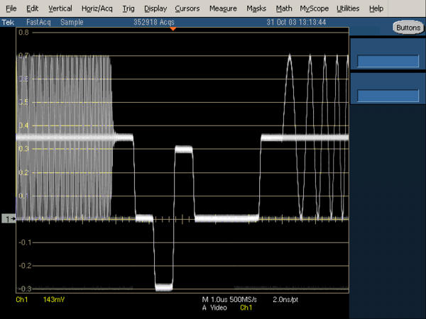 ÊÓÆµ²úÆ·Éè¼Æ¡£´Ë»ÃæËùʾΪÔÚһģÄâHDTV Èý¼¶Í¬²½ÐźÅÉÏ´¥·¢µÄÇé¾°ºÍ¼ì²éˮƽÏûÒþʱ¼ä¼ä¸ôʱµÄÇé¾°¡£