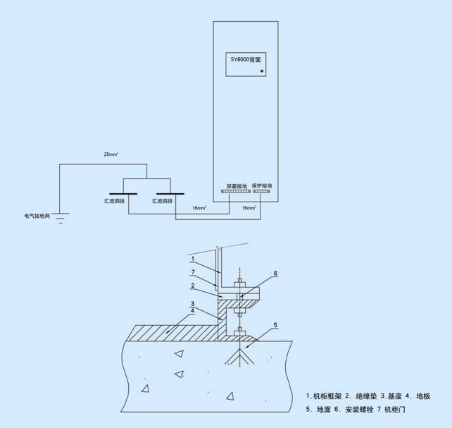 »ú¹ñ±³ÃæµÄÏ·½°²×°Ò»¸ùÆÁ±Î½ÓµØÍÅÅ£¨ºÍ¹ñÌå¾øÔµ£©ºÍÒ»¸ù±£»¤½ÓµØÍÅÅ£¬SY8000µÄÊäÈëÊä³öÐźŵçÀÂµÄÆÁ±Î²ãÁ¬½Óµ½ÆÁ±Î½ÓµØÍÅÅ£¬¶øSY8000µÄÍâ¿Ç£¨Í¨¹ýºó¸Ç°åÉϵĽӵØÂݶ¤£©ÒÔ¼°¹ñÌåÔòÁ¬½Óµ½±£»¤½ÓµØÍÅÅ£¬Á½¸ö½ÓµØÍÅŸ÷ͨ¹ý½ÓµØµçÀÂ(Ïß¾¶Ãæ»ýÖÁÉÙ16ƽ·½ºÁÃ×)Òýµ½µç×ÓÉ豸¼äµÄ»ãÁ÷ÍÅÅ´¦£¬±£»¤½ÓµØºÍÆÁ±Î½ÓµØ»ã×ܺó£¬×îºóÔÙͨ¹ýÒ»¸ùĸÏߣ¨Ïß¾¶Ãæ»ýÖÁÉÙ25ƽ·½ºÁÃ×£©Óë×ÜµÄµçÆø½ÓµØÍøÏàÁ¬¡£ |