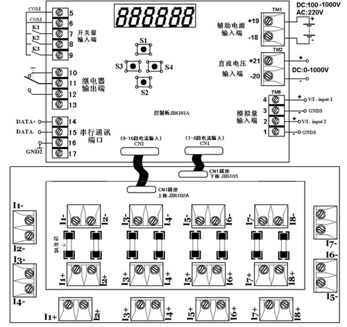 ¡¤I*+Ϊ*·µçÁ÷Á÷Èë¶Ë¿Ú£¬I*-Ϊ*·µçÁ÷Á÷³ö¶Ë¿Ú¡£ÆäÖÐÕý¸ºÂ·ºÅÏàͬµÄΪͬһ»ØÂ·£¬È磺I1+ΪµÚһ·µçÁ÷Á÷Èë¶Ë¿Ú£¬I1-ΪµÚһ·µçÁ÷Á÷³ö¶Ë¿Ú ¡¤¿ØÖưåCN1²å×ù¶ÔÓ¦µÄ»ãÁ÷°å·Êý¶ÔÓ¦¹ØÏµÎª£ºI1 ¡« I8¶Ë¿Ú·Ö±ð˳Ðò¶ÔÓ¦¿ØÖưåÏÔʾµÄµÚ1·ÖÁµÚ8·µçÁ÷ÊäÈë ¡¤¿ØÖưåCN2²å×ù¶ÔÓ¦µÄ»ãÁ÷°å·Êý¶ÔÓ¦¹ØÏµÎª£ºI1 ¡« I8¶Ë¿Ú·Ö±ð˳Ðò¶ÔÓ¦¿ØÖưåÏÔʾµÄµÚ9·ÖÁµÚ16·µçÁ÷ÊäÈë ¡¤ÉÏÏ»ãÁ÷²ÉÑù°å¿ÉÈÎÒâ×éºÏʹÓã¬ÉϰåС£¬Ï°å´ó£¬¿ÉͬʱʹÓÃÁ½¿éС°åÒ²¿É½öÓÃÒ»¿éС