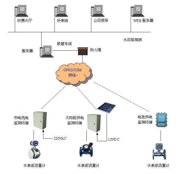 Ë®±íÔ¶´«ÏµÍ³Ä¿±ê£º½µµÍ¹©Ë®¹«Ë¾²úÏú²îÂÊ¡¢Ìá¸ß¾Óª¹ÜÀíˮƽ¡£Ë®±íÔ¶´«ÏµÍ³×é³É£º¼à¿ØÖÐÐÄ¡¢Í¨ÐÅÍøÂç¡¢ÖÕ¶ËÉ豸¡¢¼ÆÁ¿±í¾ß¡£ ¼à¿ØÖÐÐÄ: Ö÷ÒªÓ²¼þ£º·þÎñÆ÷¡¢¿Í»§¶Ë¡¢Òƶ¯Êý¾ÝרÏß»òGPRSÊý¾Ý´«ÊäÄ£¿é¡£ Ö÷ÒªÈí¼þ£º²Ù×÷ϵͳÈí¼þ¡¢Êý¾Ý¿âÈí¼þ¡¢´ó±íÔ¶³Ì¼à²âϵͳÈí¼þ¡¢·À»ðǽÈí¼þ¡£ ͨÐÅÍøÂ磺INTERNE¹«Íø + ÖйúÒÆ¶¯¹«Ë¾GPRSÍøÂç¡¢ÒÆ¶¯×¨Íø¡¢GSMÍøÂç¿ÉÑ¡¡£ ÖÕ¶ËÉ豸£ºÎ¢¹¦ºÄ²â¿ØÖÕ¶Ë£¬Êе繩µç¡¢Ì«ÑôÄܹ©µç¡¢µç³Ø¹©µç¿ÉÑ¡¡£ ¼ÆÁ¿±í¾ß£º´«Í³´ó¿Ú¾¶Ë®±í¡¢·¢Ñ¶´ó¿Ú¾¶Ë®±í¡¢ÆÕͨÁ÷Á¿¼Æ¡¢µç³Ø¹©µçÁ÷Á¿¼Æ¿ÉÑ¡¡£ ÏµÍ³ÍØÆËͼ£º