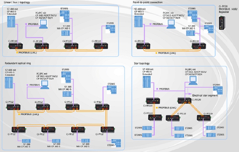 Profibus dp×ÜÏß¹âÏËÖÐ¼ÌÆ÷¿ÉʵÏÖÁ½Õ¾Ö®¼ä¹âÏ˵ã¶Ôµã£¬¶à¸öÕ¾Ö®¼ä×ÜÏß´®Áª£¬ÐÇÐÍ×éÍø¼°¶à¸öÕ¾Ö®¼ä¹âÏË×ÔÓú»·Íø×éÍø£º
