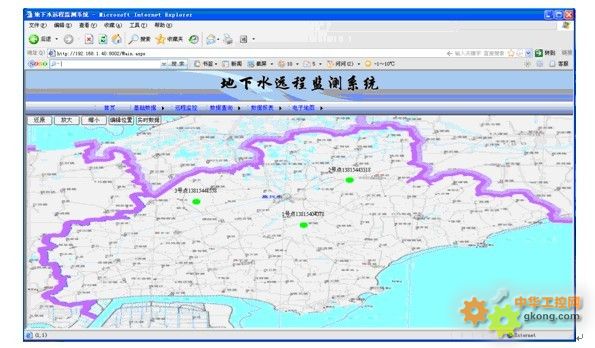 ¿ª»ú½çÃæÏÔʾµØÍ¼£¬µØÍ¼ÉÏÿ¸öµØÏÂË®¼à²âµãµÄλÖÃÒÔÔ²µãÏÔʾ£¬ºìÉ«´ú±í¹ÊÕÏ£¬ÂÌÉ«´ú±íÕý³££¬Êó±ê·ÅÖÃÔ²µãλÖÃʱ£¬ÏÔʾ¸Ã²âµãµÄˮλ¡¢Ë®ÎµÈÊý¾Ý¡£
