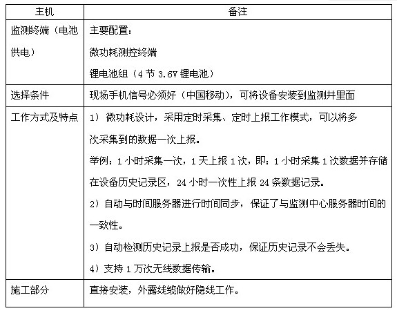 ÊÊÓÃÓÚûÓÐÕ¾·¿µÄ¼à²â¾®£¬ÄÚÖÃ1×éï®µç³Ø×é×÷Ϊ¹¤×÷µçÔ´£¬ÌرðÊʺÏÓÚûÓÐÍⲿµçÔ´¹©µçµÄÏÖ³¡»·¾³£¬Î¢¹¦ºÄÉè¼Æ£¬ï®µç³Ø×é¿ÉÒÔÕý³£¹¤×÷1-5Äê¡£