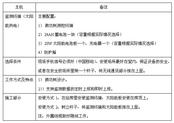 ÊÊÓÃÓÚʹÓÃÌ«ÑôÄÜ×÷Ϊ¹©µçµçÔ´µÄ¼à²âÏÖ³¡£¬Ì«ÑôÄܵçÔ´·ÖΪÈý²¿·Ö£¬Ì«ÑôÄÜµç³Ø°å¡¢Ì«ÑôÄܳäµç¿ØÖÆÆ÷¡¢Ç¦ËáÐîµç³Ø¡£¸ù¾ÝÏÖ³¡ÓõçÉ豸£¨°üº¬Î¢¹¦ºÄ²â¿ØÖÕ¶ËÓëÏÖ³¡²É¼¯É豸£©µÄ¹¦ÂÊÀ´Ñ¡Ôñ¹âµç³Ø°åµÄ´óСÓëÐîµç³ØµÄÈÝÁ¿¡£