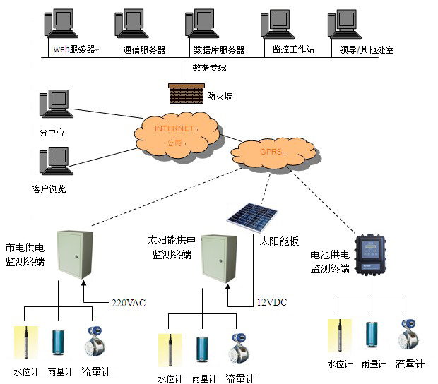 ¼à²âÖÐÐÄÓÉÊý¾Ý·þÎñÆ÷ºÍGPRSÎÞÏßÊý¾Ý´«ÊäÆ÷£¨ÈçÖÐÐÄ·ÖÅä¹Ì¶¨IPÎÞÐè´ËÉ豸£©£¬·þÎñÆ÷Éϰ²×°²Ù×÷ϵͳÈí¼þ¡¢Êý¾Ý¿âÈí¼þ¡¢¼à²âϵͳÈí¼þ¡£