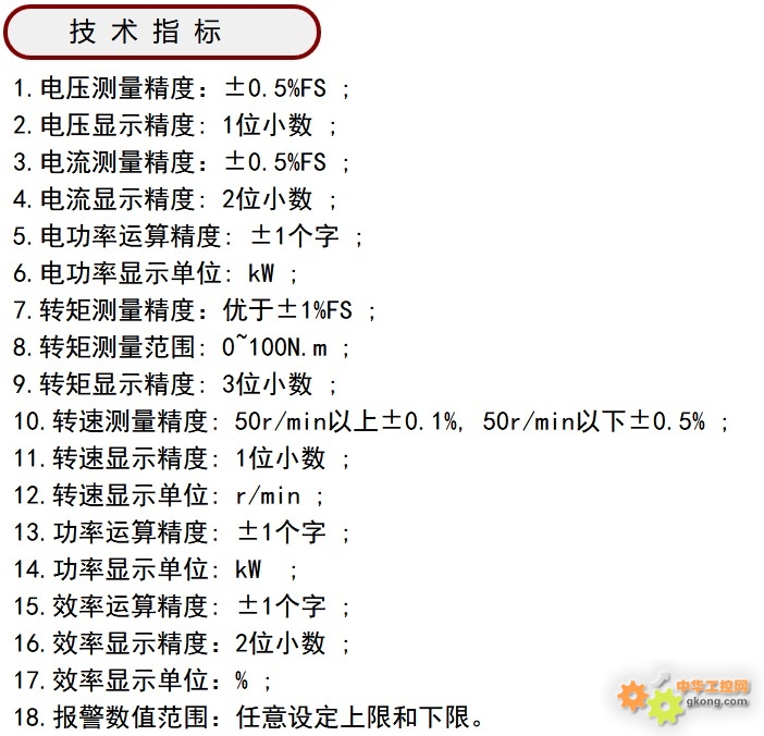 5¡¢ÄܶԵçÁ÷¡¢µçѹ¡¢×ª¾Ø¡¢×ªËÙ·Ö±ð½øÐÐÉÏ¡¢ÏÂÏÞ±¨¾¯£¬±¨¾¯Öµ¿ÉÈÎÒâÉ趨¡£