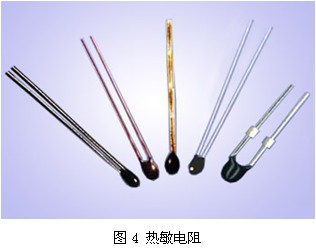 熱敏電阻是對溫度敏感的半導體(圖4),與RTD相xiang似si,其qi阻zu抗kang隨sui溫wen度du變bian化hua而er變bian化hua。熱re敏min電dian阻zu由you玻bo璃li或huo環huan氧yang珠zhu封feng裝zhuang的de金jin屬shu氧yang化hua物wu半ban導dao體ti材cai料liao製zhi造zao而er成cheng。而er且qie,熱re敏min電dian阻zu的de典dian型xing標biao稱cheng阻zu抗kang值zhi要yao比biRTD高得多,阻抗值從2000Ω到10,000Ω,故可用於較低電流的測量。熱敏電阻具有較高的靈敏度(約200 Ω/°C),這使得它對於溫度的變化非常靈敏,具有極高的響應速率,但它的使用範圍最高為300至500 °C。同(tong)樣(yang),熱(re)敏(min)電(dian)阻(zu)也(ye)需(xu)要(yao)激(ji)勵(li),接(jie)線(xian)方(fang)式(shi)也(ye)有(you)二(er)三(san)四(si)線(xian)製(zhi)之(zhi)分(fen),但(dan)是(shi)由(you)於(yu)熱(re)敏(min)電(dian)阻(zu)的(de)標(biao)稱(cheng)阻(zu)抗(kang)非(fei)常(chang)高(gao),所(suo)以(yi)連(lian)線(xian)阻(zu)抗(kang)不(bu)會(hui)影(ying)響(xiang)其(qi)測(ce)量(liang)值(zhi)的(de)精(jing)度(du),因(yin)此(ci),二(er)線(xian)製(zhi)測(ce)量(liang)精(jing)度(du)對(dui)於(yu)熱(re)敏(min)電(dian)阻(zu)已(yi)經(jing)足(zu)夠(gou),所(suo)以(yi)這(zhe)種(zhong)接(jie)線(xian)方(fang)式(shi)在(zai)熱(re)敏(min)電(dian)阻(zu)中(zhong)最(zui)為(wei)常(chang)用(yong)。