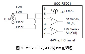 NI SCC-RTD01是針對熱電偶調理的雙通道模塊,可連接2、3或4線鉑電阻RTD(圖3)。NI SCC-RTD01的每一通道都帶有一個增益為25的放大器和一個30Hz低通濾波器,每一模塊上還提供用於1或2個RTD的1mA激勵源。NI SCXI-1102模塊與NI SCXI-1581電流激勵模塊一起使用,可以提供32通道的高精度RTD或熱敏電阻調理。1102帶有一個2 Hz低通濾波器,1581則提供穩定的100µA電流源,從而確保測量精度。由於SCXI采用模塊化設計,在應用需求改變時可以方便地擴展數據采集係統。