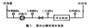 從圖 1 中可以看出,全年負荷大多集中於最大負荷的 50 %~ 70 %之間, 而且當負荷大於總負荷的 50 %時,一般需開冷機,其餘時間可用新風抵消冷負荷。因此設計時考慮全年負荷變化對冷機及其他設備進行大小搭配選擇, yibianzaishineilengfuhejiaoxiaoshikaiqixiaoxingshebei,erzailengfuhejiaodashizaikaiqidaxingshebei,jinliangbimianlengjijiqitashebeizaidifuhelvdeqingkuangxiayunxing,qidanweizhilengliangdehaodianlianghuizengjia,yincishidangxuanzelengjixinghao,baozhenggaoxiaolvyunxing,yekejianshaoxitongnenghao,dadaojienengdemude。 很多工程設計中主機往往選擇一樣型號的機組,雖然係統配置較簡單、控製簡便,但機組全年 60 %以上的時間在 50 % -70 %fuhezhuangkuangxiayunxing,zaochengxitongtiaojiebugoulinghuo,fuhedifengshidamalaxiaoche,xingchengdaliuliangxiaowencha,dixiaoyunxingdezhuangkuang,shiduinenghaodejidalangfei。xuanzedaxiaolengjizuhe,daxiaojizupeizhibutongdaxiaodelengshuibeng、冷卻水泵及冷卻塔,水係統設計及控製可能較為複雜;但在工程設計中,設計者不能一味追求係統配置的簡單而摒棄節能的原則。 2 水泵的選擇 lengshuibenghelengqueshuibengderongliangshianjianzhuwuzuidadeshejifuhexuandingde,shuibengyangchengyouxitongzuibulihuanluyanchengzulihejubuzulizhihequeding。shijigongchengyinxitongguanlufuza,zulijisuanwangwangzhishiculvejisuan,erkaolvhengaodeanquanxishu,zheyangshuibengyangchengxuanzewangwangpianda, 泵揚程在 0 . 4 ~ 0 . 5MPa 的設計常能見到。以某辦公樓為例進行說明,圖 2 為辦公樓冷凍機房內的冷卻水係統圖。