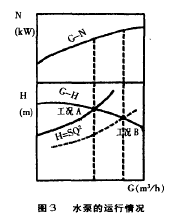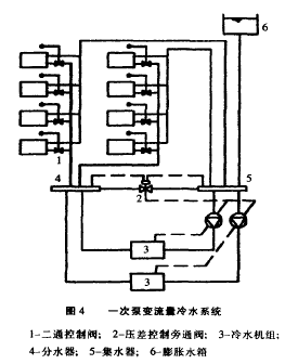 冷凍機製冷量為 l 250kW , 冷卻水量設計為 300m 3 / h 左右,選擇的冷卻水泵額定流量 310m 3 / h ,揚程 50m ,從圖 2 測量參數可以知道,冷卻水泵的揚程在 20 ~ 25m 左右就可滿足要求,現在水泵揚程過大,閥門消耗了 29m 水柱,冷卻水泵達 60 %能量被消耗在閥門上。水泵的工作特性 ( 流量、壓頭的變化 ) 與管道特性曲線密切相關。管道特性曲線: H=SQ 2 式中: H 為管道係統的壓力損失 ,Pa ; Q 為流量 ,m 3 / s ; S 為綜合阻力係數,與管路的沿程阻力和局部阻力有關。 綜合阻力係數,與管路的沿程阻力和局部阻力有關。通常係統運行時, S 是固定的,而隨著管路阻力的增大,曲線會變陡;隨著管路阻力的減小,曲線會變得平坦一些,使得水泵運行工況也隨著變化。在圖 2 係統中, 閥門消耗了大部分揚程的電能,對水泵的節能是極為不利。如圖 3 所示,如果完全打開水閥,減小閥門的阻力,水泵的運行工況 A 點就會變為工況 B ,效率下降,電耗增加,而且可能會比水泵電機的額定功率大很多,這樣,就很可能會將水泵電機燒毀。 水泵的選擇計算,應貫徹執行國家節能設計標準 (GB50189 ― 93) 對水係統”水輸送係數”的要求:空調供冷的水輸送係數不得小於 30 。.同時對係統最不利環路阻力的計算應該力求準確 以選擇適當水泵揚程使水泵達到經濟運行的目的。 另外泵的設置,經常未考慮冬夏季空調水量的差別,冬夏共用 l 台水泵,冬季大流量小溫差,低效運行,電能浪費很大。為此建議冬夏季的冷水循環泵和熱水循環泵分別設置。 3 空調水係統節能措施 (1) 目前空調冷水係統大都采用 1 級(ji)泵(beng)定(ding)流(liu)量(liang)係(xi)統(tong)。水(shui)泵(beng)容(rong)量(liang)是(shi)按(an)冷(leng)水(shui)機(ji)組(zu)最(zui)大(da)負(fu)荷(he)時(shi)選(xuan)定(ding)的(de),且(qie)全(quan)年(nian)在(zai)固(gu)定(ding)的(de)水(shui)流(liu)量(liang)下(xia)工(gong)作(zuo)。當(dang)一(yi)些(xie)空(kong)調(tiao)末(mo)端(duan)停(ting)機(ji)時(shi),水(shui)閥(fa)不(bu)能(neng)關(guan)閉(bi),回(hui)水(shui)溫(wen)度(du)隨(sui)著(zhe)降(jiang)低(di),使(shi)得(de)供(gong)回(hui)水(shui)間(jian)溫(wen)差(cha)減(jian)小(xiao)。由(you)於(yu)季(ji)節(jie)晝(zhou)夜(ye)和(he)建(jian)築(zhu)物(wu)使(shi)用(yong)功(gong)能(neng)的(de)不(bu)同(tong),實(shi)際(ji)空(kong)調(tiao)負(fu)荷(he)在(zai)一(yi)年(nian)絕(jue)大(da)部(bu)分(fen)時(shi)間(jian)內(nei)遠(yuan)比(bi)設(she)計(ji)負(fu)荷(he)低(di) ( 前麵也談到過 ) ,全年有 60 %的時間實際負荷是在設計負荷的 50 %~ 70 % 以下運行,而冷水流量不變情況下,供回水間溫差由設計的 5~ 7 ℃ 降為 0 . 5 ~ 1 . 0 ℃ ,即係統在大流量小溫差的情況下工作,從而浪費了水泵運行的輸送能量,且增大了管路係統的冷熱量損失。 為wei了le較jiao好hao實shi現xian節jie能neng目mu標biao,考kao慮lv空kong調tiao水shui係xi統tong設she計ji為wei變bian流liu量liang係xi統tong。在zai空kong調tiao末mo端duan設she二er通tong閥fa,依yi據ju室shi內nei恒heng溫wen器qi的de信xin號hao或huo送song風feng溫wen度du信xin號hao,控kong製zhi二er通tong閥fa門men的de開kai度du,改gai變bian用yong戶hu ( 負荷側 ) deshuiliuliangdadaobianliuliangdemude。danzailengyuance,tongguolengshuijizuzhengfaqideshuiliuliangshibunengdiyusuoxushuiliangdeedingzhide,fouzedaozhilengshuiwenduguodi,shenzhiyoujiebingweixian,suoyizaigonghuishuiganguanzhijianxushezhidaitiaojiefadepangtongguanyibaozhengtongguolengshuijizuzhengfaqideshuiliuliangdehengding 一次泵變流量係統冷源側常采用多台冷水機組和多台冷水泵 ( 每台冷水泵對應 1 台冷水機組 ) 的方式。此時,每台水泵水流量不變,冷水泵和相應的冷水機組進行台數控製,以使冷水機組在部分負荷下進行節能運行,其係統如圖 4 所示。