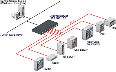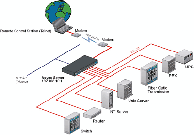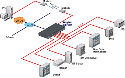 異步通訊服務器的主要功能之一是用來當作撥入/撥出服務器,隻要將Modem連接到異步通訊服務器的一個串口上,遠端的係統管理員就能通過私人的的PPP撥號來訪問所有需要管理的設備 (例如,無需通過 ISP)。實際上,使用異步通訊服務器的撥入功能可以直接連線到異步通訊服務器,而不需要通過ISP來傳遞信息,也無需提供一個公有IP地址給服務器。 一種有效的連接方案