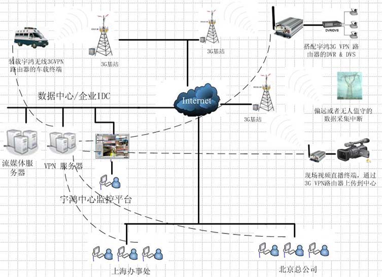 係統背景: 隨著電信運營商的3G業務的推出,3G無線上網以其上網速率高,無需布線,移動等特點,提供了光纖專線,ADSL寬(kuan)帶(dai)上(shang)網(wang)無(wu)法(fa)比(bi)擬(ni)的(de)便(bian)利(li)性(xing),正(zheng)逐(zhu)步(bu)的(de)成(cheng)為(wei)目(mu)前(qian)寬(kuan)帶(dai)接(jie)入(ru)不(bu)可(ke)缺(que)少(shao)的(de)補(bu)充(chong)的(de)方(fang)式(shi),在(zai)一(yi)些(xie)無(wu)固(gu)定(ding)地(di)點(dian),有(you)線(xian)寬(kuan)帶(dai)無(wu)法(fa)到(dao)達(da)的(de)地(di)方(fang),但(dan)是(shi)又(you)需(xu)要(yao)高(gao)帶(dai)寬(kuan)接(jie)入(ru)的(de)環(huan)境(jing)下(xia)發(fa)揮(hui)獨(du)特(te)的(de)作(zuo)用(yong)。本(ben)方(fang)案(an)通(tong)過(guo)引(yin)入(ru)宇(yu)鴻(hong)科(ke)技(ji)3G VPN 路由器,加上傳統的基於有線以太網的視頻設備無縫快速的接入到3G無線網絡,可廣泛用於在應急指揮和移動監控,金融和電力數據采集等許多行業。 除了3G提供的無線上網之外,在應用層方麵,由於是通過運營商的公共網絡,因此安全性是必須考慮的因素,同時由於目前全球IPV4地址緊張,一般通過3G接入所獲取的ip地址一般不能從internet上直接訪問,引入VPN可以建立企業自己的虛擬局域網,正好可以從安全性和可訪問性兩個方麵很好的解決這兩個問題。