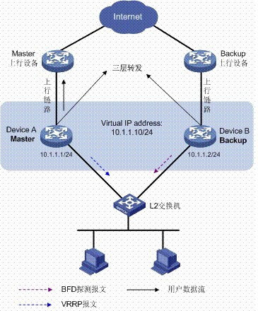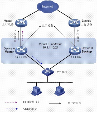 Backup能夠立即切換成為新的Master路由器,維持網絡通訊。 Backup路由器監視Master路由器采用的是具有快速檢測功能的BFD技術。在Backup