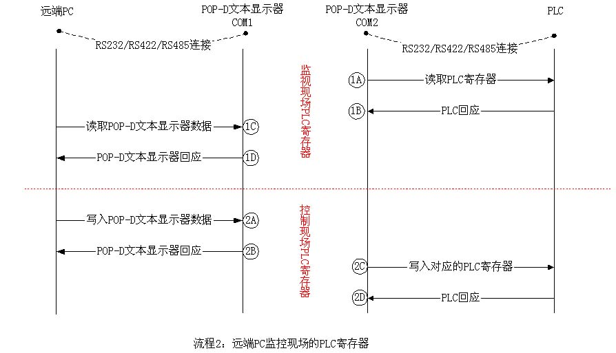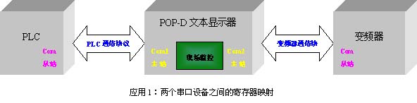 POP-D文本顯示器可以用其兩個串行端口連接變頻器和PLC,並分別進行設備的狀態監視和參數設定。在一些工業應用場合,變頻器的一些參數需要傳輸至PLC處理;同樣地,PLC也會需要對變頻器的參數進行設定。此時,就可以用JB_HMI_D軟件提供的數據傳輸功能實現,連接圖如【應用1】,通信流程圖如【流程1】。