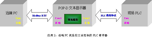 需要說明的一點是,在圖【應用2】中,連接至Com1的設備選擇為【Modbus RTU Master】,即遠端PC機作為主站,POP-D文本顯示器作為從站。這樣選擇的好處是:POP-D文本顯示器讀取PLC中的參數後存暫存在文本內部,隻有當遠端PC機發起讀命令時才回應數據給PC;同樣地,POP-D文本顯示器隻有在接收到遠端PC 發出的控製命令,才會把數據寫入到現場PLC中,從而也大大降低了PLC的通信負荷。